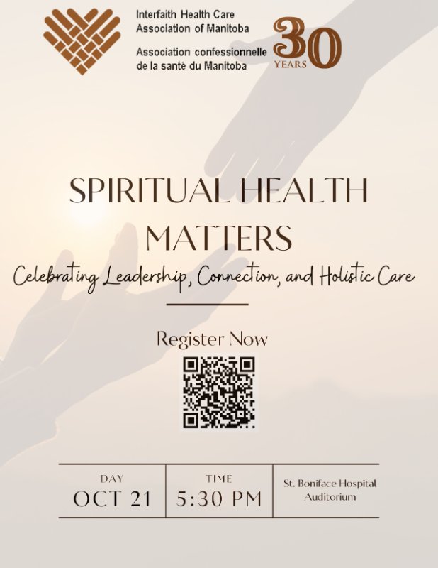 The event will take place on Tuesday, October 21, 2025, at the Samuel N. Cohen Auditorium, St. Boniface Hospital, and will feature an evening program highlighting the importance of spiritual health in Manitoba’s health-care system and communities.